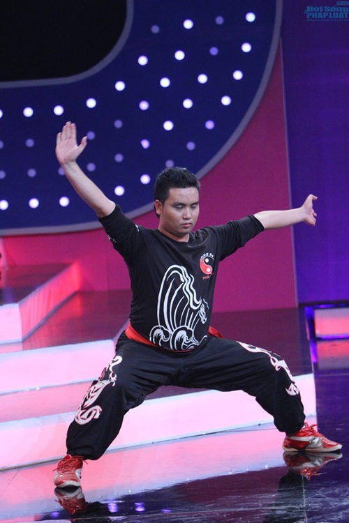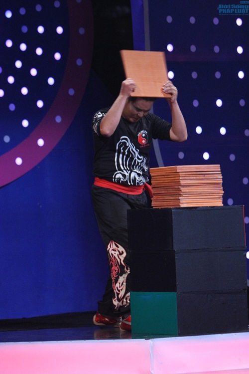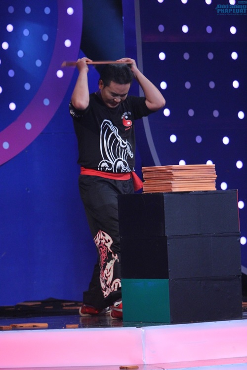 “Siêu nhân” Trương Minh Cường đã biểu diễn đập gạch bằng đầu trước sự thán phục của các nghệ sỹ và hàng trăm khán giả tại trường quay. |