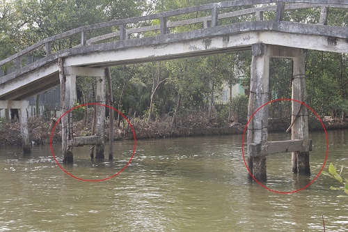 Do mật độ giao thông qua cầu khá đông đúc, để “chữa cháy”, địa phương đã cho gia cố tạm bằng các cây gỗ, rồi cột dây thép níu vô thân trụ cầu. Tuy nhiên, đây chỉ là giải pháp tạm thời, tiềm ẩn nhiều nguy cơ, gây bất an cho bà con nhân dân mỗi khi đi qua cầu. Hơn nữa, mặt cầu nhỏ hẹp, chỉ vừa cho một chiếc xe máy chạy qua,thiết kế cầu dốc đứng, gây khuất tầm nhìn nên rất dễ bị tai nạn.
