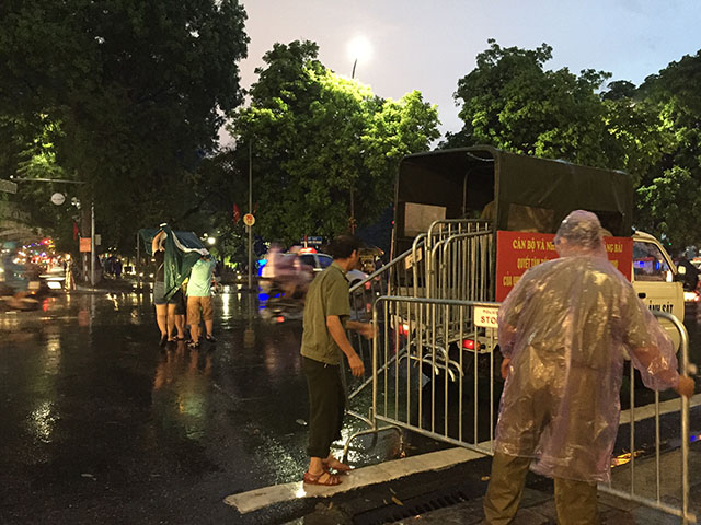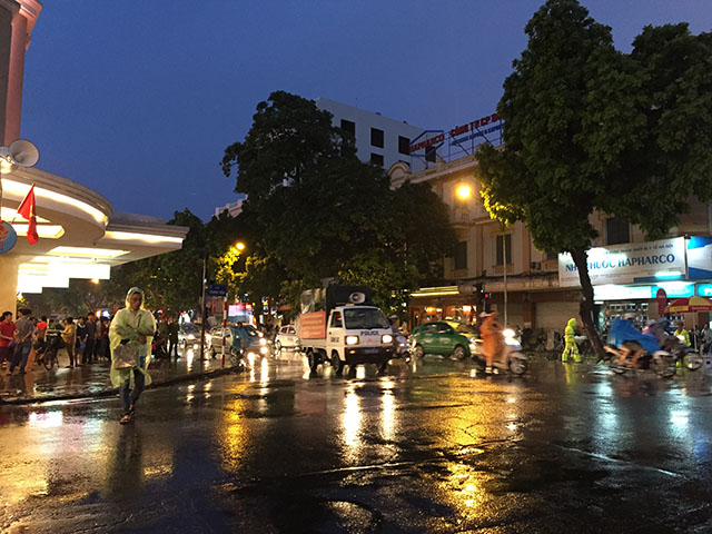 Dù đến 21h những màn pháo hoa mới khai hỏa, nhưng ngay từ sẩm tối, người dân ở Hà Nội không ngại mặc áo mưa, che ô ngồi dưới vỉa hè, lòng đường chờ đến thời khắc được mãn nhãn với những màn trình diễn pháo hoa đẹp mắt.