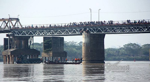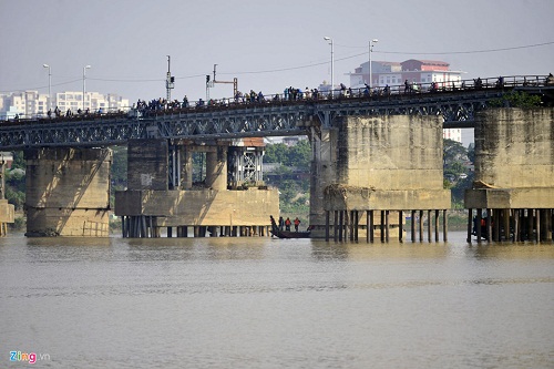 | Người dân hiếu kỳ đứng vào thành cầu để xem công tác trục vớt quả bom dưới chân cầu Long Biên (Ảnh: Vietnamnet) |