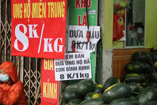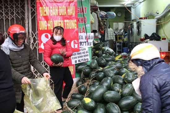 Một khách hàng mua dưa hấu, bà Đinh Thị Nguyệt (trú tại Ngọc Hà, Hà Nội) chia sẻ: "Dưa rẻ nên mua về cho gia đình và chia sẻ bạn bè, đồng thời góp một tay hỗ trợ người nông dân miền Trung trong tình cảnh khó khăn” này. |