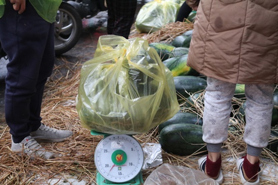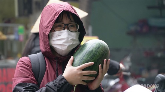 Dù thời tiết mưa rét, rất nhiều người dân đã tới ủng hộ một điểm "giải cứu" dưa hấu tại 273 Khương Trung (quận Thanh Xuân, Hà Nội). |