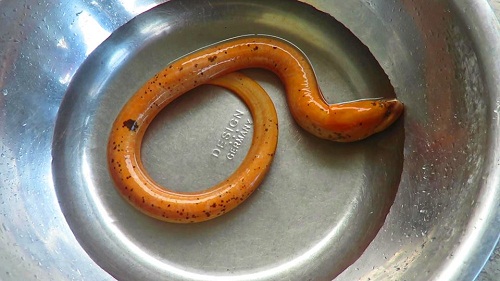 Con lươn màu vàng mà anh Phạm Văn Sơn bắt được. |