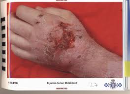 McNicholl, một người đàn ông ở Anh nói rằng anh đã bị bạn gái dí thuốc lá vào mũi, đánh bằng thanh sắt nóng, điện thoại di động, búa và thậm chí còn bị đổ nước sôi vào giữa háng của mình.