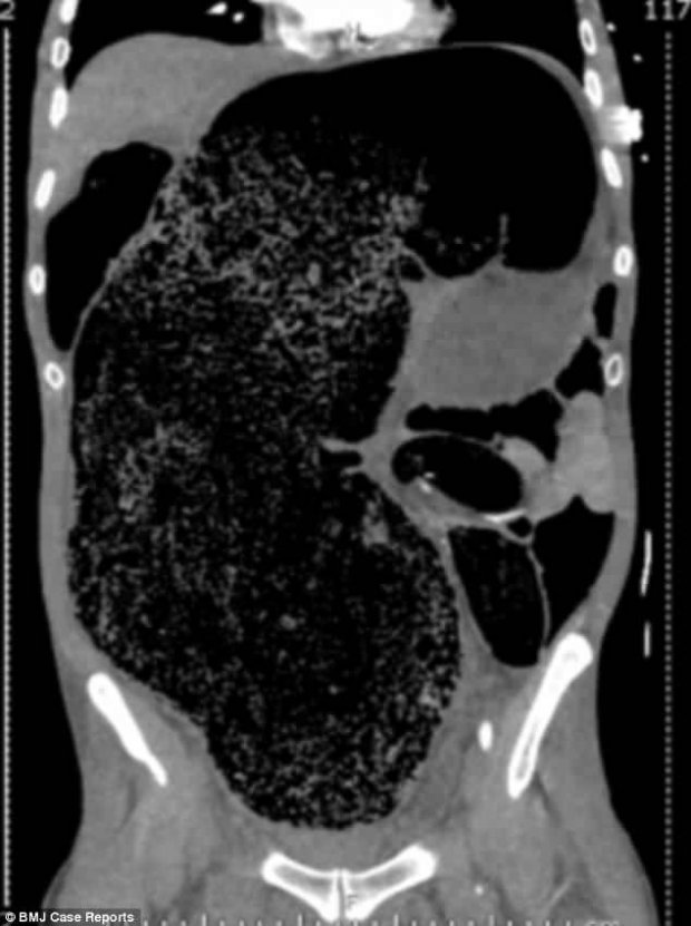 Ảnh chụp CT cho thấy lượng phân khổng lồ tích tụ trong khoang bụng bệnh nhân. |