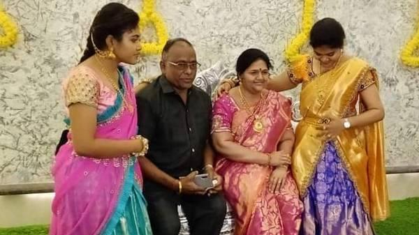 Hai cô con gái đứng hai bên của ông Srinivas Gupta và bức tượng người mẹ đã mất của họ. |