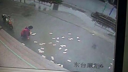 Cọc tiền bị tung ra là toàn bộ số tiền gồm toàn những tờ 100 NDT bay toán loạn trên vỉa hè. Nhưng thật là may mắn cho Yang, không hề có cảnh mọi người xung quanh xông vào hôi của. Thay vào đó, bất chấp trời đang mưa, người qua đường và các nhân viên ngân hàng đã chạy lại giúp anh thu thập lại số tiền trên.