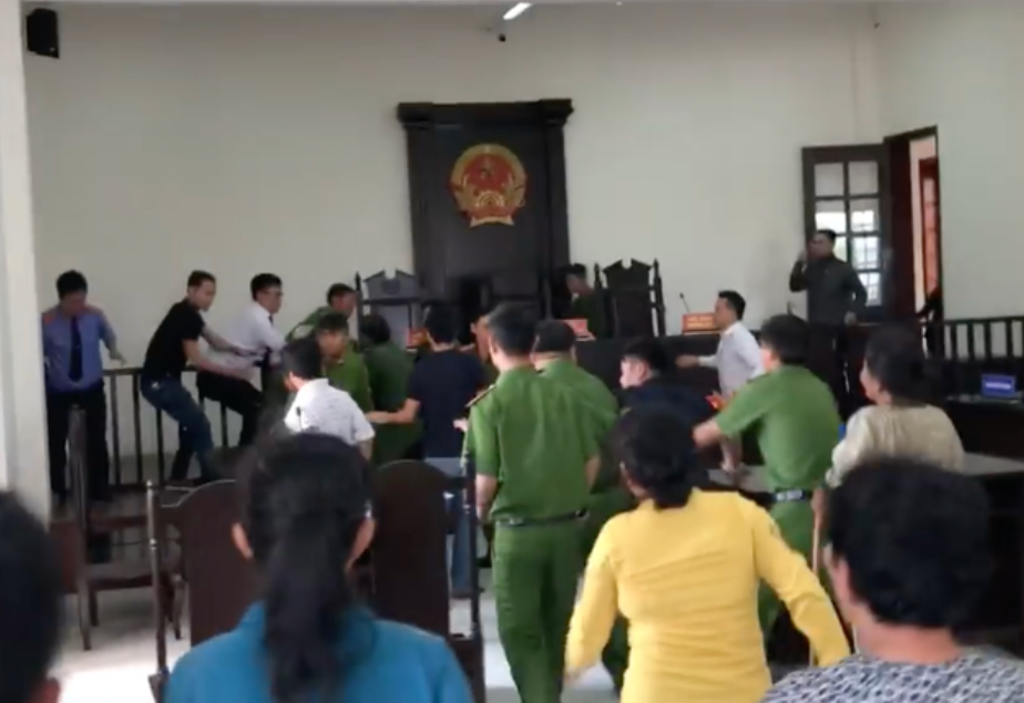 Bị can Hiền lao đến đánh Kiểm sát viên, gây náo loạn phiên tòa - Ảnh: Người Đưa Tin |
