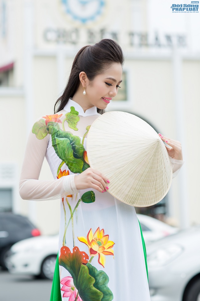 | Dương Kim Ánh thể hiện vẻ đẹp dịu dàng với áo dài, nón lá khá giản dị. |