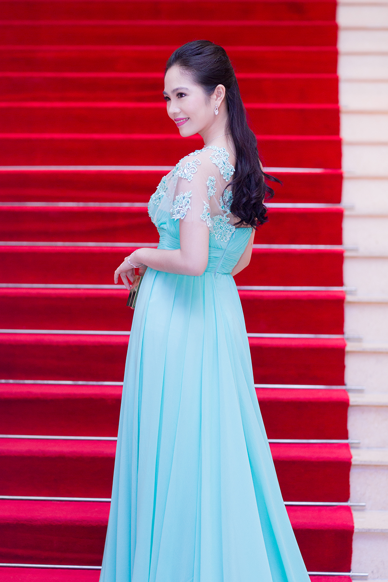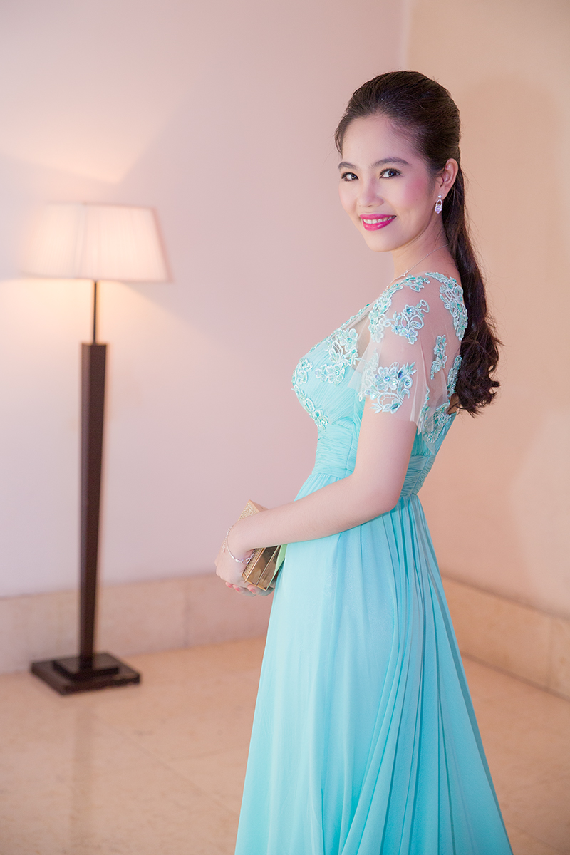 Nữ hoàng Du lịch Việt Nam 2014 Dương Kim Ánh xuất hiện khá nổi bật giữa các người đẹp với bộ váy dạ hội màu xanh bạc hà tươi mát. Bộ váy trơn nhưng không đơn điệu nhờ những đường xếp ly tinh tế dọc thân và chân váy. Kiểu tóc bới cao cùng trang sức nhẹ nhàng tôn thêm vẻ duyên dáng cho người đẹp.