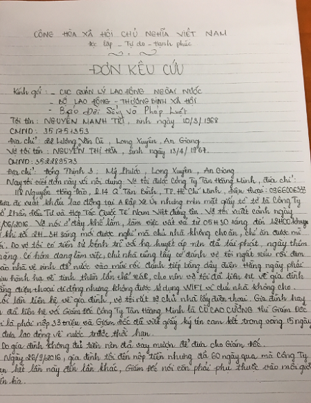 Trong đơn cầu cứu ông viết: "Vợ nói ở đây khổ lắm, làm việc vất vả từ 05h30 sáng đến 12h00 khuya, có khi tới 2h-3h sáng mới được nghỉ mà chủ nhà không cho ăn, chỉ được ăn mì gói. Do vợi tôi có tiền sử bệnh trĩ với hạ huyết áp nên đã tái phát, ngày thêm nặng. Có hôm đang làm việc, chủ nhà cũng lấy cớ đánh vợ tôi ngất xỉu rồi đem vào nhà vệ sinh đổ nước vào mũi rồi đánh tiếp bằng dây điện..."