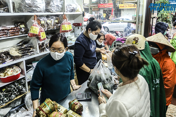 Từ 8h ngày 28 Tết Tân Sửu, dù trời mưa rét nhưng người dân vẫn xếp hàng dài để chờ tới lượt mua bánh chưng, giò chả của cửa hàng có tuổi đời 200 năm ở phố cổ Hà Nội.