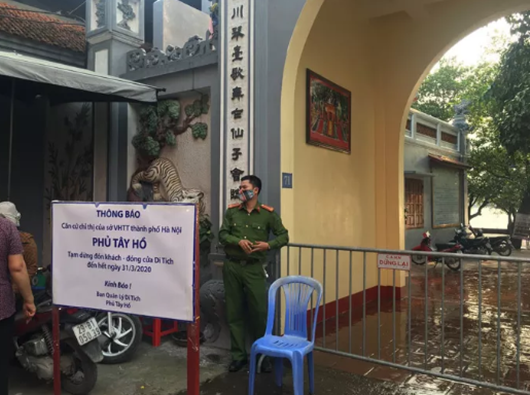 Đến chiều 24/3, Ban quản lý Phủ Tây Hồ thông báo đóng cửa đến hết ngày 31/3, đồng thời có lực lượng chức năng lập chốt chặn ở phía ngoài di tích. Ảnh: Người Lao Động |