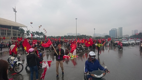 Bất chấp thời tiết mưa rét, người hâm mộ phía Bắc vẫn đang ùn ùn đổ ra đường, đến các điểm tập trung, sẵn sàng cổ vũ cho đội tuyển U23 Việt Nam trong trận chung kết lịch sử.