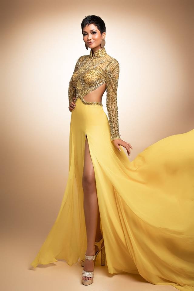 Trên page chính thức của Hoa hậu Hoàn vũ Việt Nam cũng thông báo: Evening Gown- Đầm vàng là sự kết hợp tuyệt vời giữa truyền thống và hiện đại, với phần cổ của Áo Dài truyền thống Việt Nam và phần dưới xẻ tà táo bạo, gợi cảm.