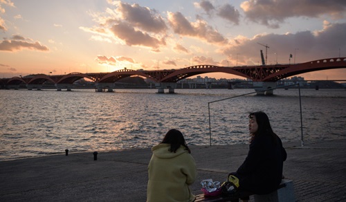 Phụ nữ ngồi chơi trên băng ghế cạnh sông Hàn ở Seoul - Ảnh: SCMP. |