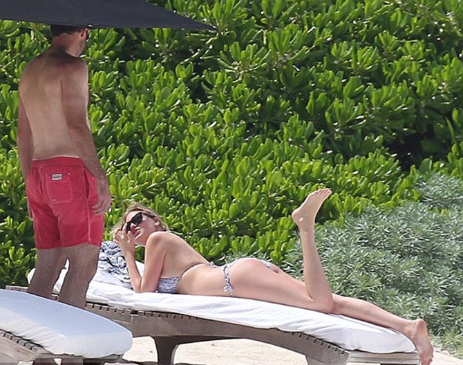 | Kate Upton và chàng người tình - cầu thủ bóng chày Justin Verlander thư giãn trên bãi biển Cacun hôm 15/7. |