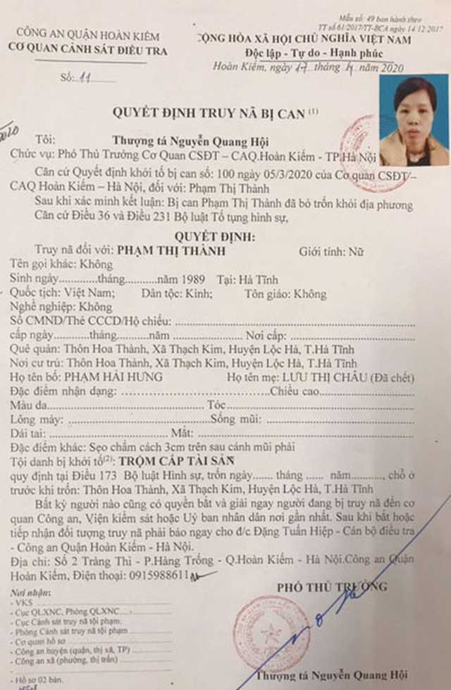 Người mẹ nhẫn tâm vứt bỏ đứa con sơ sinh tại hố gas ở Sơn Tây (Hà Nội) - đang là đối tượng bị cơ quan công an quận Hoàn Kiếm phát lệnh truy nã vì tội trộm cắp tài sản.