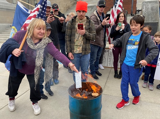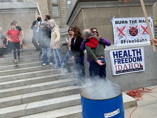 Người biểu tình đốt khẩu trang trước trụ sở cơ quan lập pháp ở thành phố Boise, bang Idaho, Mỹ. Ảnh: Thời báo Hoàn Cầu |