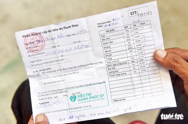 Mỗi người được cấp một phiếu, trong đó đánh dấu 5 món hàng mà mình chọn mua - Ảnh: Tuổi trẻ |