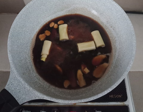 - Bước 1: Trong một chảo vừa, cho nước, rượu sake, nước tương, mirin và đường và đun sôi lửa vừa.
