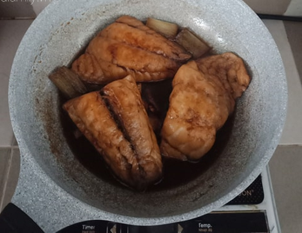 - Bước 3: Đậy nắp hoặc dùng màng nhôm phủ lên mặt cá (mục đích đậy nắp hoặc phủ màng nhôm là để hỗn hợp nước sôi phủ mình cá cho cá thấm đều dù ít nước kho) đun liu riu cho cá thấm gia vị, có thể trở mình cá 1 lần hoặc không đều được. Khi nước kho cạn 1/2 là hoàn tất.