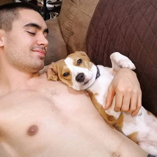 Nam diễn viên chụp hình bên thú cưng. |