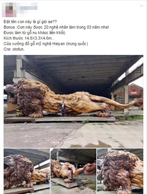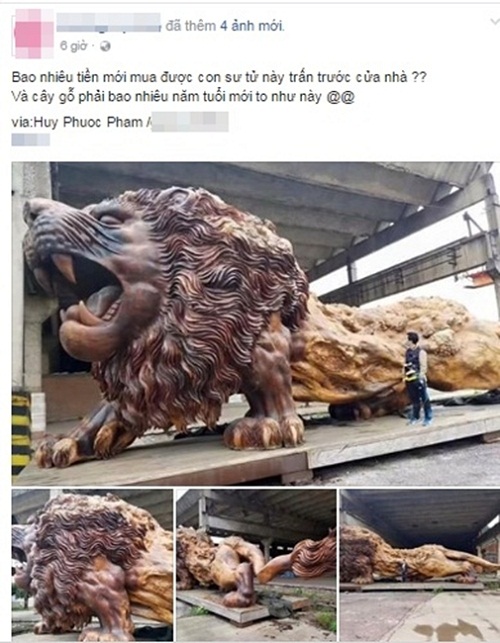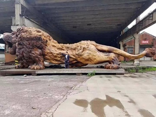 Mới đây, trên một fanpage mạng xã hội truyền tay nhau hình ảnh về một con sư tử bằng gỗ nguyên khối khổng lồ. Hình ảnh này nhanh chóng thu hút sự chú ý của dân mạng, ai cũng trầm trồ về kích thước siêu lớn của con sư tử, tuy nhiên điều khiến mọi người quan tâm nhất là liệu giá trị của con sư tử này nằm ở mức nào.