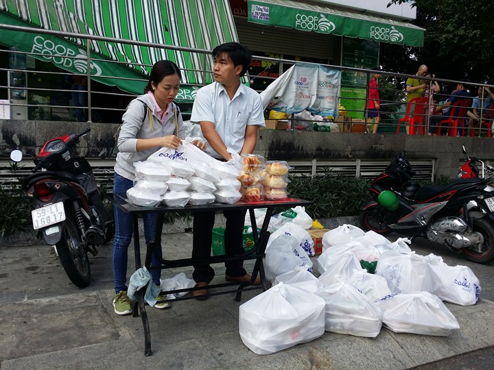 Những suất cơm tạm thời chuẩn bị cho người dân ở khu chung cư. |