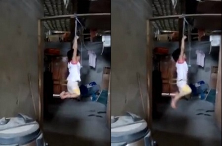 Trước đó, trên mạng xã hội lan truyền đoạn clip dài hơn 30 giây, ghi lại cảnh một cháu bé bị treo lơ lửng trên xà nhà. Theo nội dung đoạn video, cháu bé bị cột 2 tay vào dây, treo lên xà nhà. Cháu bé gào khóc và liên tục giãy giụa.