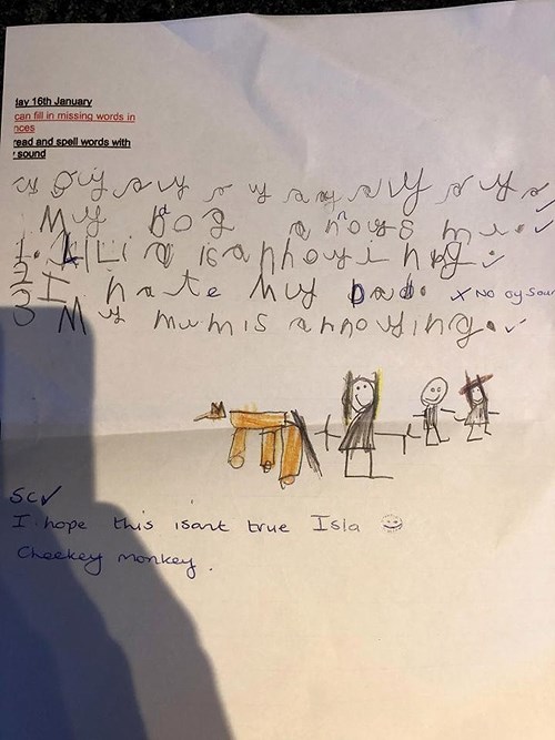 Khi gặp mẹ của Isla, chị Natalie Fowler, 33 tuổi, ở sân vui chơi, cô giáo của Isla đã tiến lại và hỏi liệu chị đã đọc bài tập về nhà mà cô bé làm chưa? Lúc trở về, bà mẹ hai con sống tại thành phố Sheffield, South Yorkshire (Anh), lập tức kiểm tra bài văn của Isla.