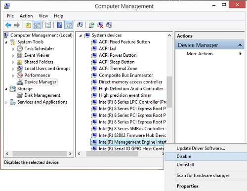 Tìm trong phần System devices nhấp chọn Intel (R) Managerment Engine Interface tiếp theo bạn phải Click chuột phải chọn Disable