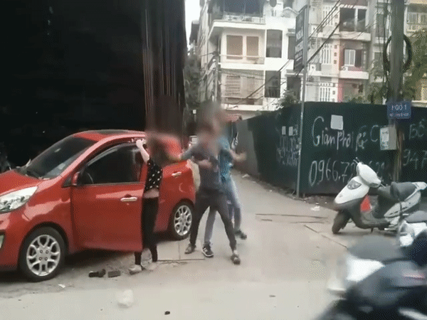 Người chồng đã lao vào đấm đá giật tóc vợ, mặc kệ cậu con trai đứng gào khóc. Người vợ chỉ biết phản kháng bằng cách giơ tay chống trả và cố gắng bám vào cửa xe ô tô.