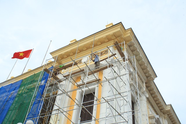 | Chiều 28/7, Nhà hát lớn đã được bắc giáo để sơn lại. |