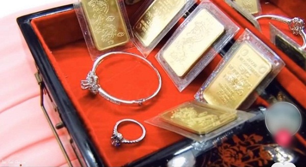 Không kém cạnh, nhà gái cũng trao cho cô dâu của hồi môn cực khủng gồm nhẫn kim cương, vàng miếng, đồ trang sức,...