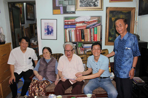 Nhạc sĩ Nguyễn Đức Toàn (áo trắng, ở giữa) và nhạc sĩ Trương Ngọc Ninh (áo xanh bên cạnh). |