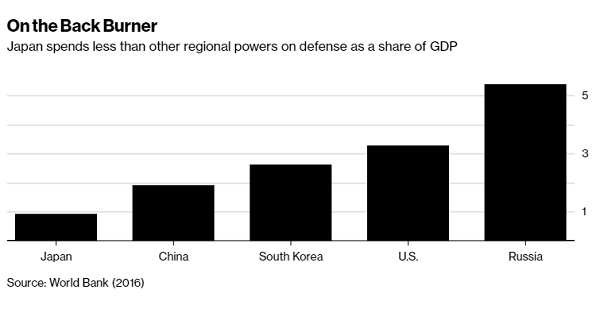 Mặc dù các mối đe dọa an ninh trong khu vực đã trở nên cấp bách hơn phần đông người dân cũng như chính phủ Nhật vẫn ủng hộ đường lối ngoại giao hòa bình và tập trung chi tiêu cho an sinh xã hội thay vì chạy đua vũ trang. Ngân sách quốc phòng đã tăng khoảng 10% kể từ khi Thủ tướng Shinzo Abe nhậm chức vào năm 2012 và chiếm khoảng 1% GDP – con số khiêm tốn so với 3,3% của Mỹ.