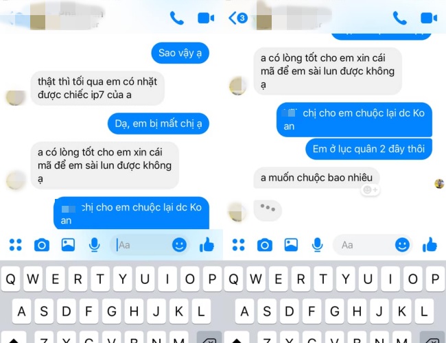P.N tiết lộ, kẻ lạ mặt có nickname là V.P. Sau khi P.N ngỏ ý chuộc lại điện thoại với giá 3 triệu đồng, cô gái vẫn nhất quyết không đồng ý. Lý do được đưa ra là “không an toàn” và nhất định phải xin được mật khẩu để sử dụng vì bản thân cũng thích chiếc iPhone 7 này.