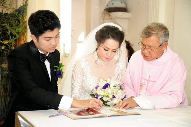 Cô dâu và chú rể cùng ký vào sổ gia đình công giáo, cả hai được công nhận nên duyên vợ chồng. |