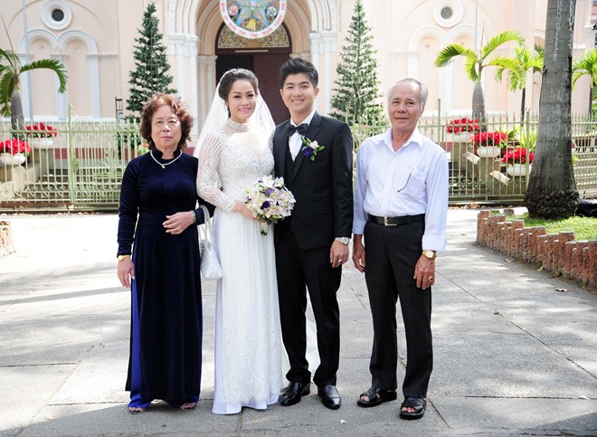 Cô dâu và chú rể chụp ảnh cùng bố mẹ đỡ đầu của cả hai trước khi bước vào nhà thờ làm nghi lễ. |