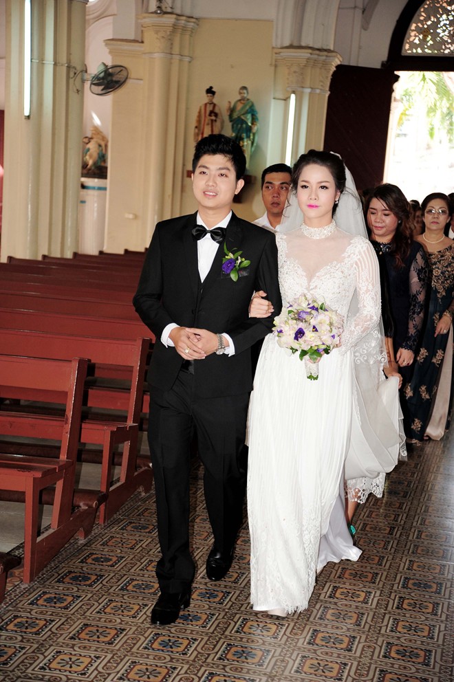 Nhật Kim Anh hạnh phúc nắm tay chồng bước vào thánh đường. Gương mặt của người đẹp khá căng thẳng. |