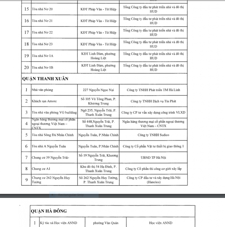Bên cạnh đó, danh sách công khai đợt 3 lần này còn có các công trình như: Tòa nhà 27 Huỳnh Thúc Kháng của Công ty CP ĐT và QL BĐS UDIC tại số 27 Huỳnh Thúc Kháng (phường Láng Hạ, quận Đống Đa); Chung cư số 6 Đội Nhân tại quận Ba Đình của Công ty CP tập đoàn đầu tư Ba Đình; Viện Quy hoạch đô thị nông thôn tại số 10 Hoa Lư (phường Lê Đại Hành, quận Hai Bà Trưng) của Bộ Xây dựng; Chung cư Newtatco tại khu 7,2ha Vĩnh Phúc (quận Ba Đình) do Công ty TNHH MTV ứng dụng công nghệ mới và du lịch làm chủ đầu tư.