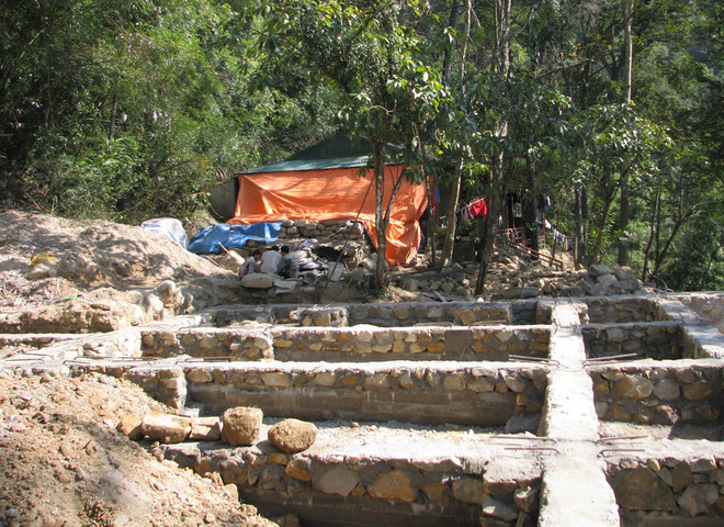 Nền móng mới bằng bê tông cốt thép của phế tích Am Dược. Ảnh VnExpress. |