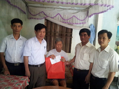 | Ông Nguyễn Quang Hòe, Giám đốc Bệnh viện Đa khoa huyện Hương Sơn (thứ 2 bên trái sang) cùng Liên đoàn lao động huyện Hương Sơn tặng quà cho thân nhân gia đình chính sách, người có công với cách mạng |