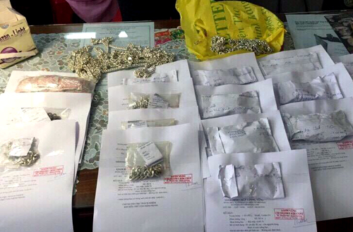 | Tang vật các vụ án mà nhóm lừa đảo thực hiện ở các tiệm vàng, tiệm cầm đồ. Ảnh: VnExpress |