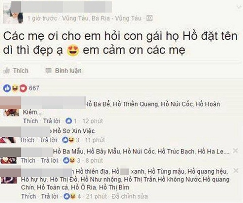 | Trước đó một bà mẹ trẻ cũng đã nhận cái kết "phũ" khi nhờ dân mạng đặt tên cho con gái họ Hồ |