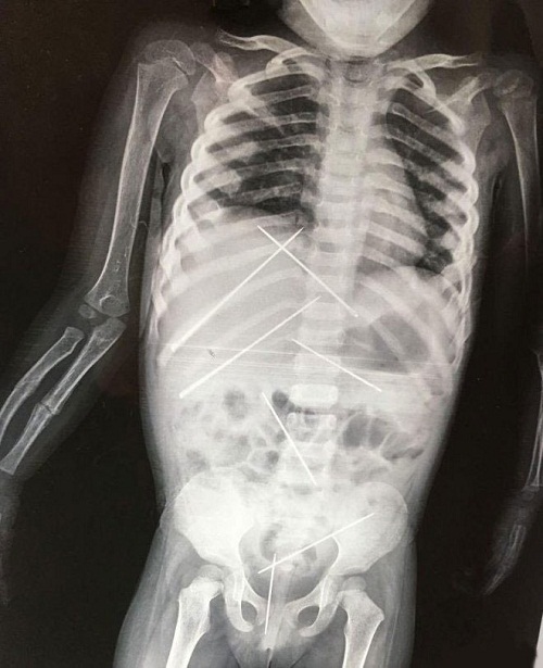 Qua kiểm tra và tiến hành chụp X-quang, các bác sĩ đã sốc khi phát hiện 7 cây kim dài 5 cm găm vào bụng của cô bé. Thậm chí, Goswami còn bị gãy một cánh tay.