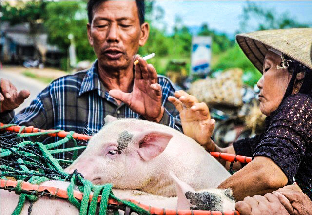 Trời tỏ hơn một chút. Tiếng xe “min khờ” nổ giòn từ phía mờ xa đi tới. Một người đàn ông chở heo phi thẳng vào chợ. Một xe, hai xe, ba xe... những chiếc xe cà tàng chở theo hàng tá rọ heo, chẳng mấy chốc đã kín chợ. Tiếng kêu eng éc, tiếng người ra rả náo động cả một vùng. Lúc này, công việc của nhóm người bà Liễu bắt đầu.