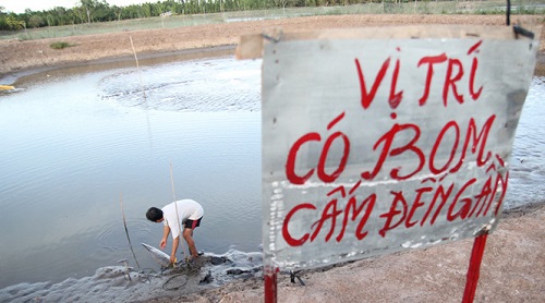 Dù bên cạnh ao nuôi cá đã có biển cảnh báo “Vị trí có bom cấm đến gần”, nhưng nhóm người này vẫn vô tư kéo quả bom 300kg lên bờ chỉ để… xem cho biết.