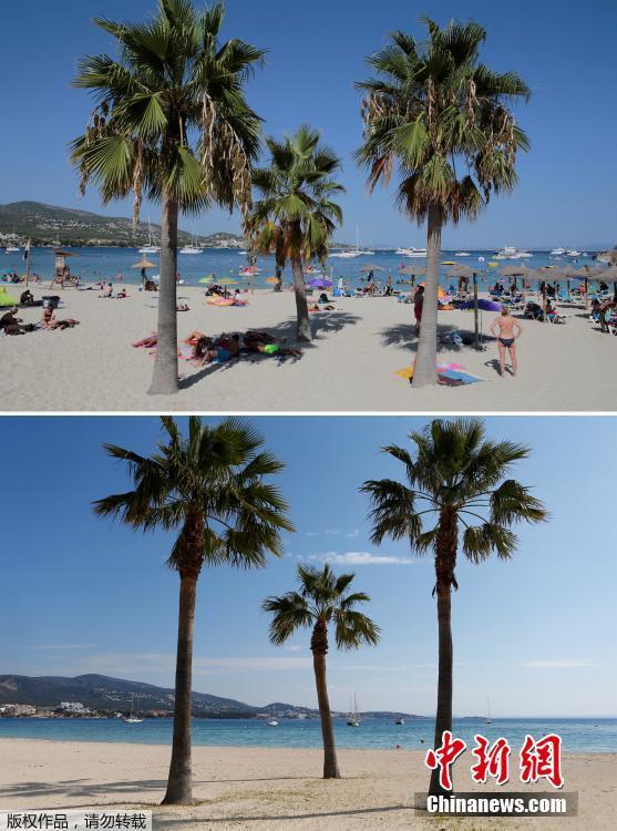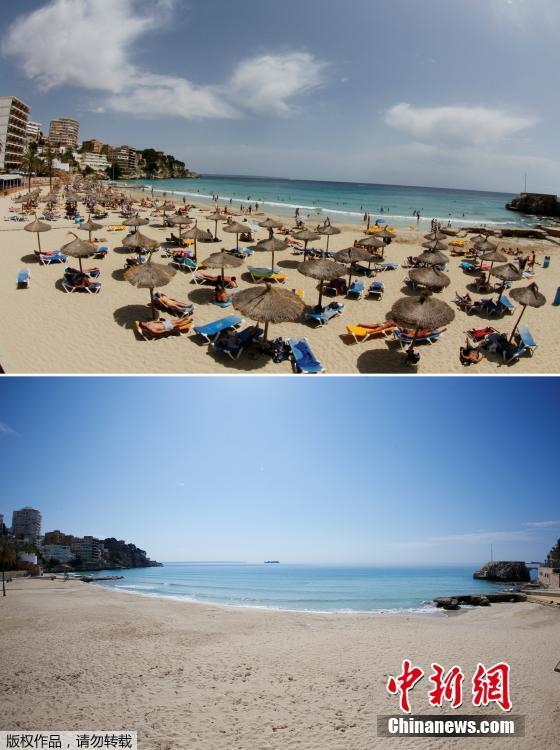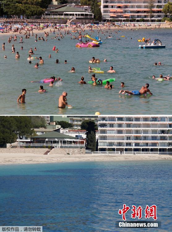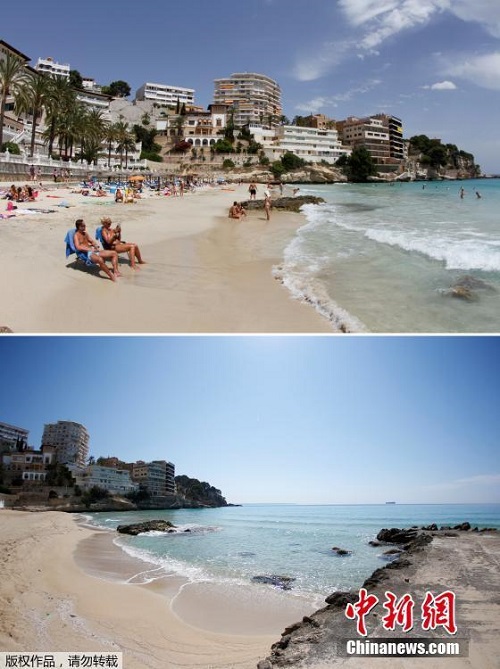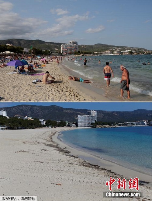 Bức ảnh trên cho thấy khách du lịch đang chơi đùa trên bãi biển Palmanova hồi mùa hè năm ngoái, trái ngược hoàn toàn so với bức ảnh bên dưới vào hôm 9/4 vừa qua. Ảnh: China News |